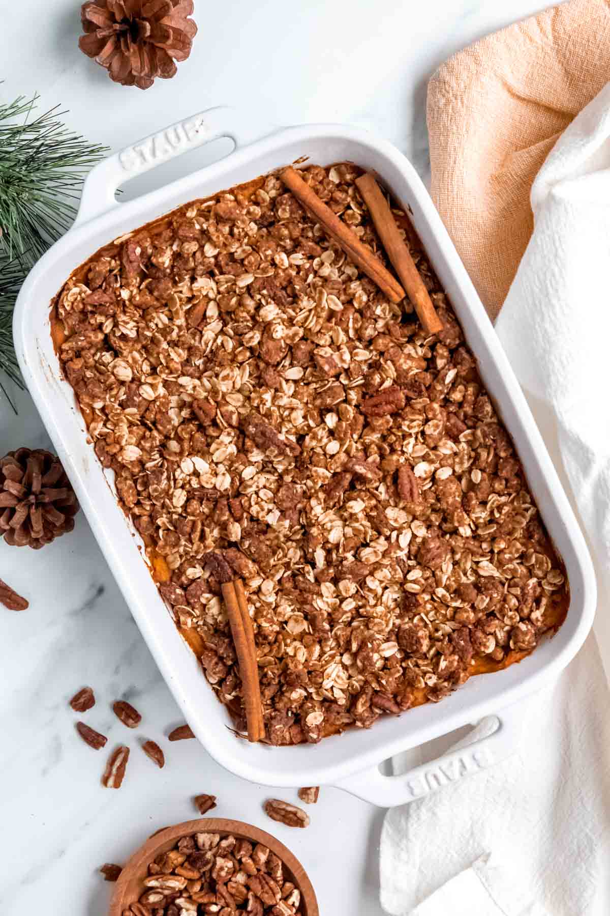 A twist on the classic: creamy sweet potato base, crunchy oat-pecan topping, naturally sweetened and made to feed a crowd — comforting, shareable, and totally holiday-table ready.