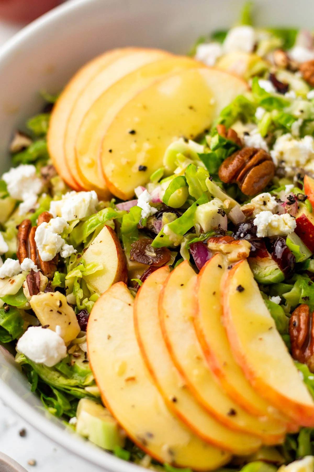 Raw shaved brussels sprouts meet tart apple, pecans, goat or feta cheese and an apple-cider vinaigrette — light but full of texture and ideal to balance out heavier holiday mains.